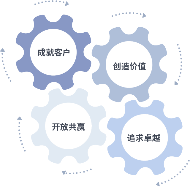 成就客户是一切决策的出发点,,,创造价值是衡量所有工作的标准,,追求卓越是我们做事做人的态度,,,,开放共赢是我们的格局也是最终的结果。。。价值观的齿轮环环相扣,,,推动着组织里的每个人不断向前。。